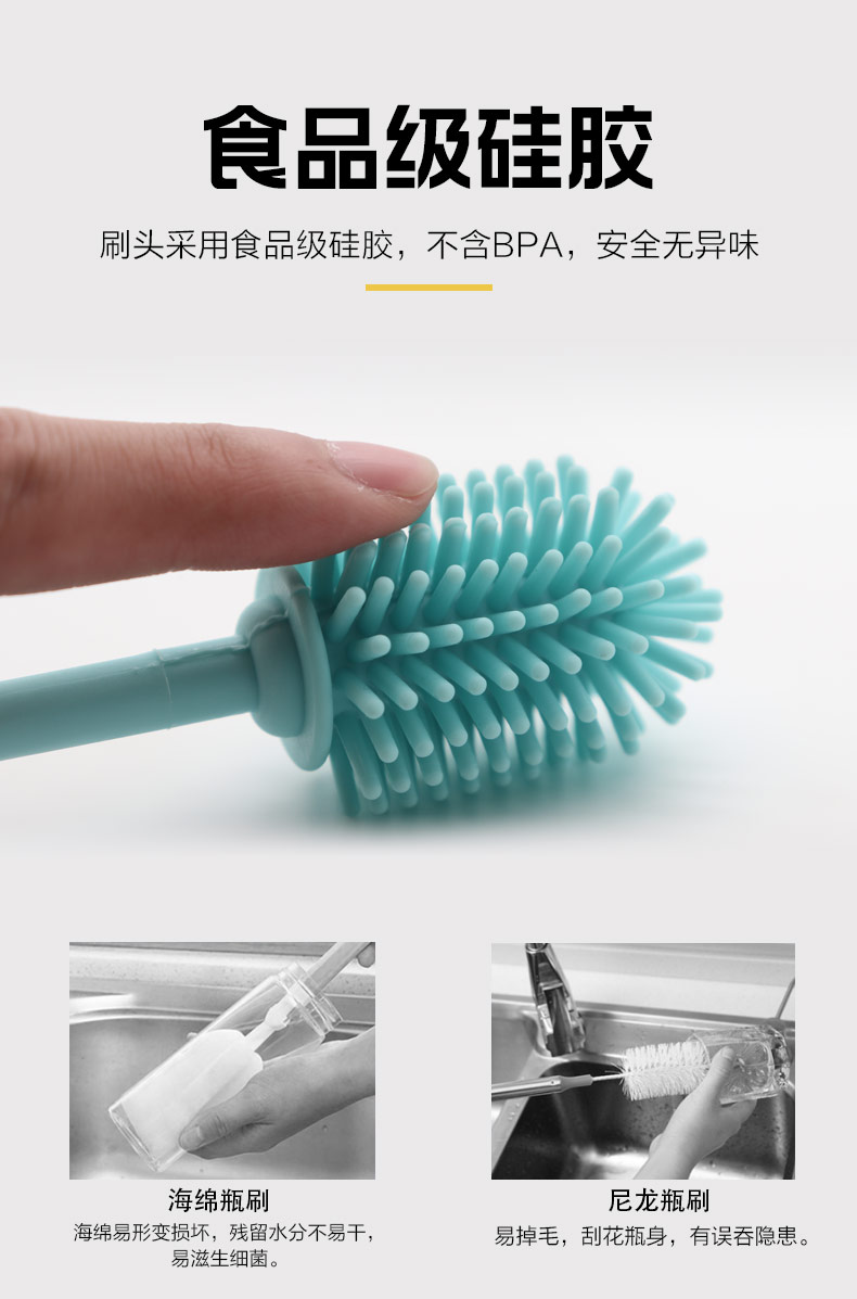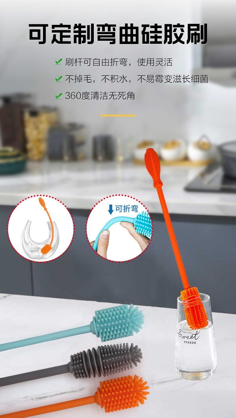 給心愛的杯子配一個(gè)硅膠刷,可以360度清潔水杯內(nèi)壁,刷頭采用食品級(jí)硅膠,不含BPA,無(wú)異味,相比海綿瓶刷不容易變形,不容易殘留水分滋生細(xì)菌。適合各類杯子的清潔??铺├鳛橐患夜枘z制品OEM廠家,有能力也有條件定制可彎頭的硅膠刷,人性化的設(shè)計(jì),易懸掛便利瀝水,節(jié)約空間。