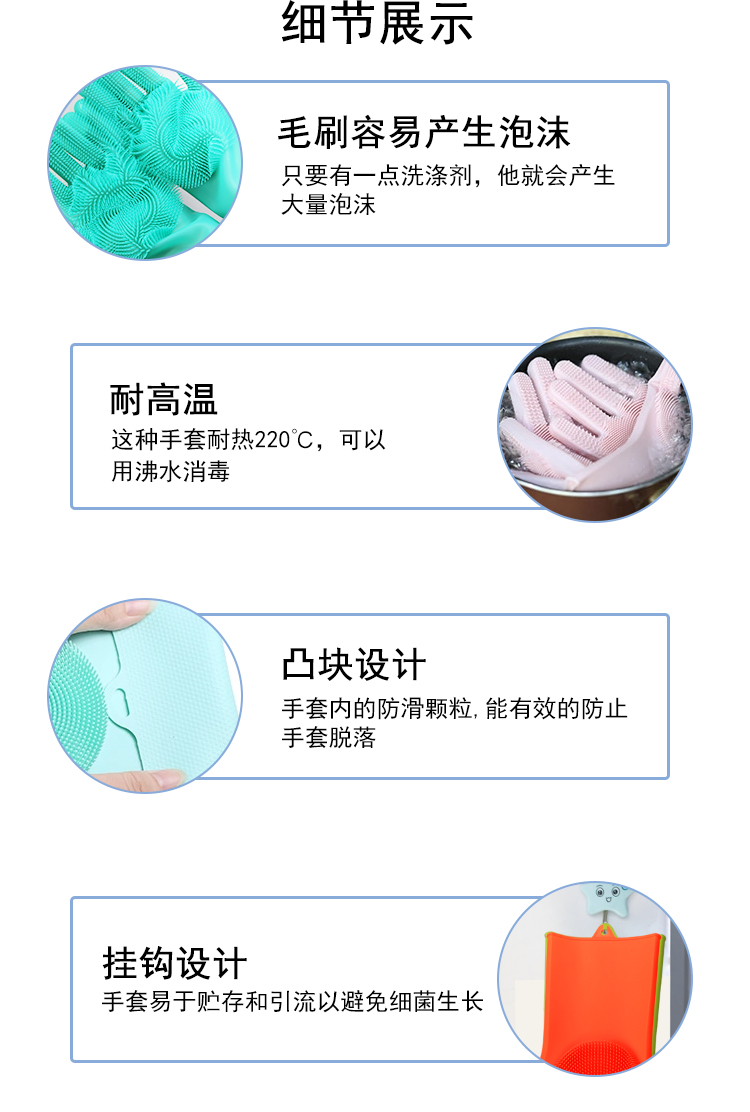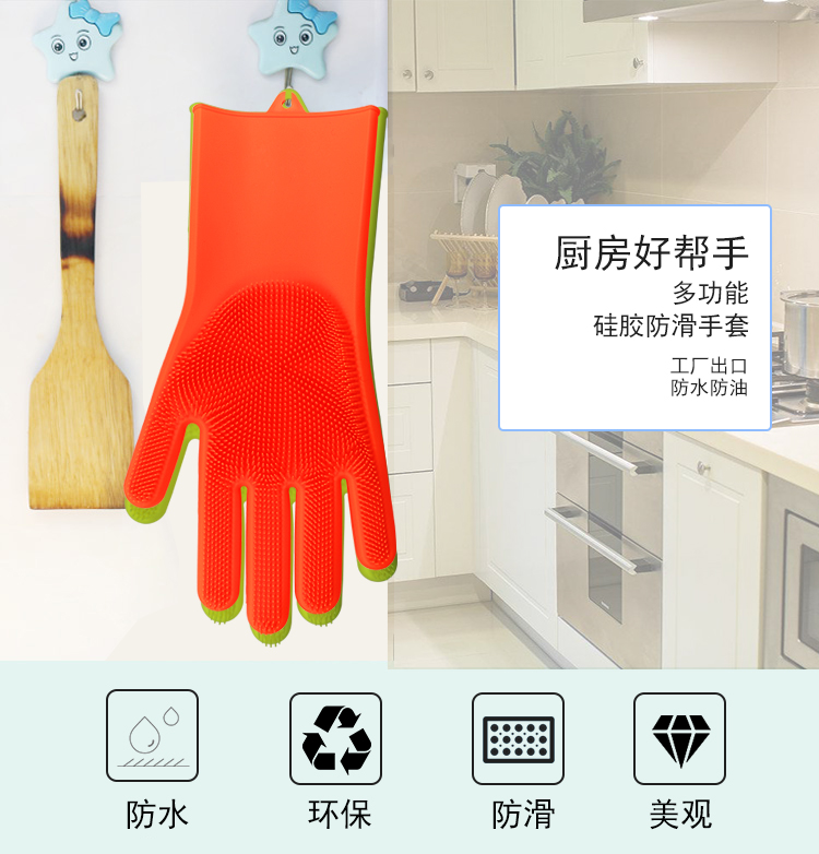 硅膠清潔手套是近年來比較火熱的廚房清潔用品。采用柔軟硅膠健康材質(zhì),手套正面有多重清潔刷頭,耐磨耐熱,強力去除污漬。